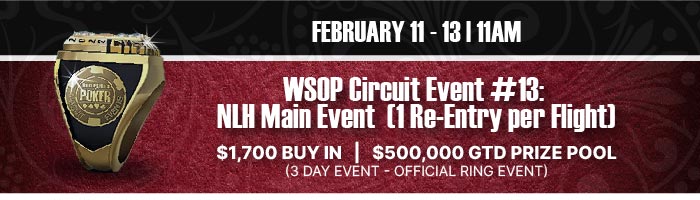 12:00pm: WSOP Circuit Event #13 (Day 2) | $1,700 No Limit Hold'em Main Event ($500,000 GTD) Official Ring Event (Two-Day Event)